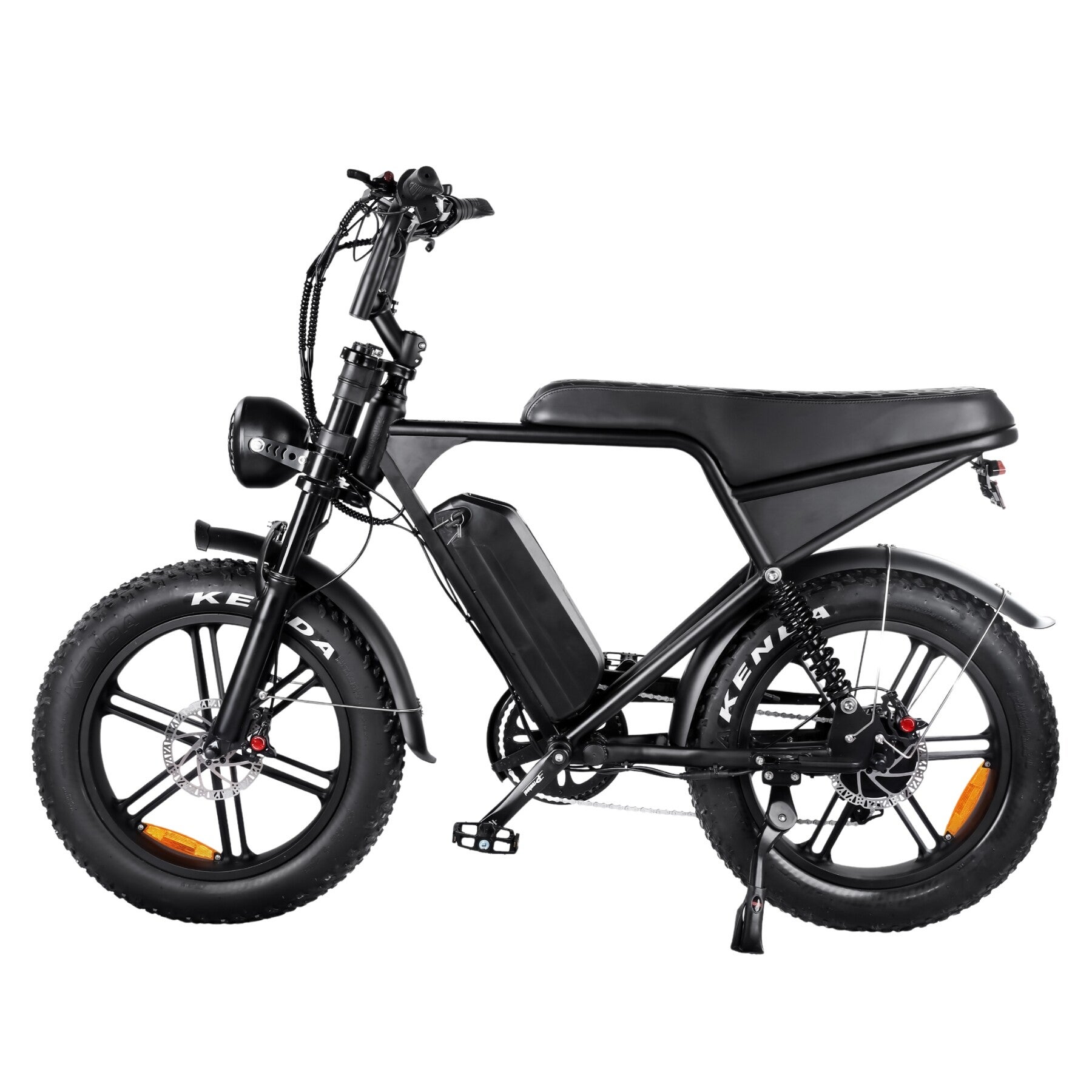 De V8 Pro 24-inch is een compacte maar krachtige fatbike die perfect is voor zowel stadsritten als langere avontuurlijke tochten. Met de keuze uit een enkele 15.3Ah accu of een dubbele 26.4Ah accu kun je jouw fiets afstemmen op jouw rijbehoefte. Het strakke zwarte design geeft de fiets een stoere, moderne uitstraling.